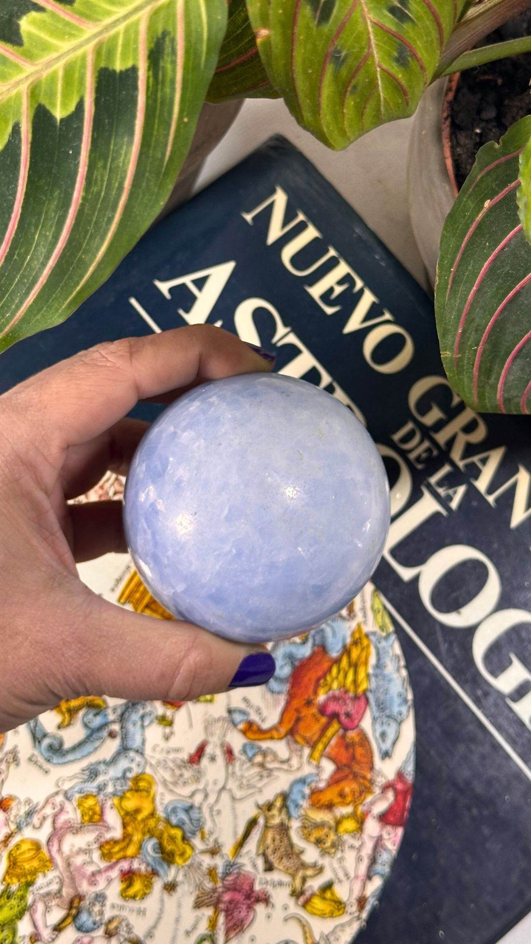 Esta Esfera de Celestina, un mineral reconocido por su energía suave y elevada, asociada con la claridad mental, la calma y la conexión espiritual. Su tonalidad azul celeste translúcida, combinada con zonas más opacas, le confiere una apariencia etérea y armoniosa.